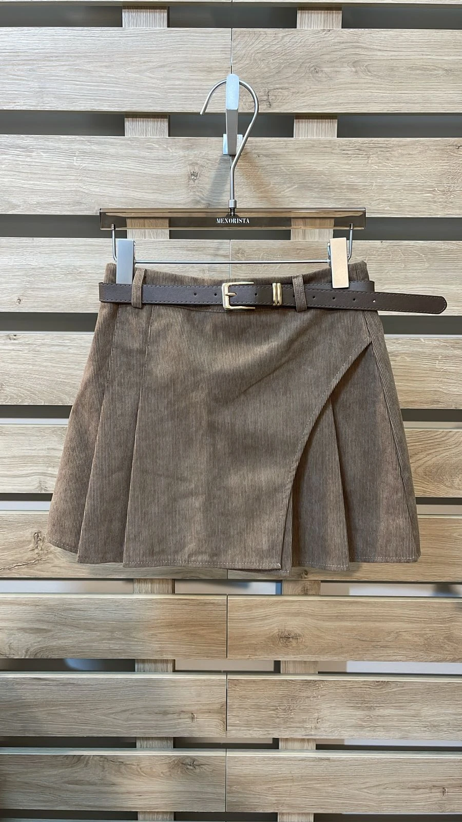 Side Pleated Belted Camel Skirt