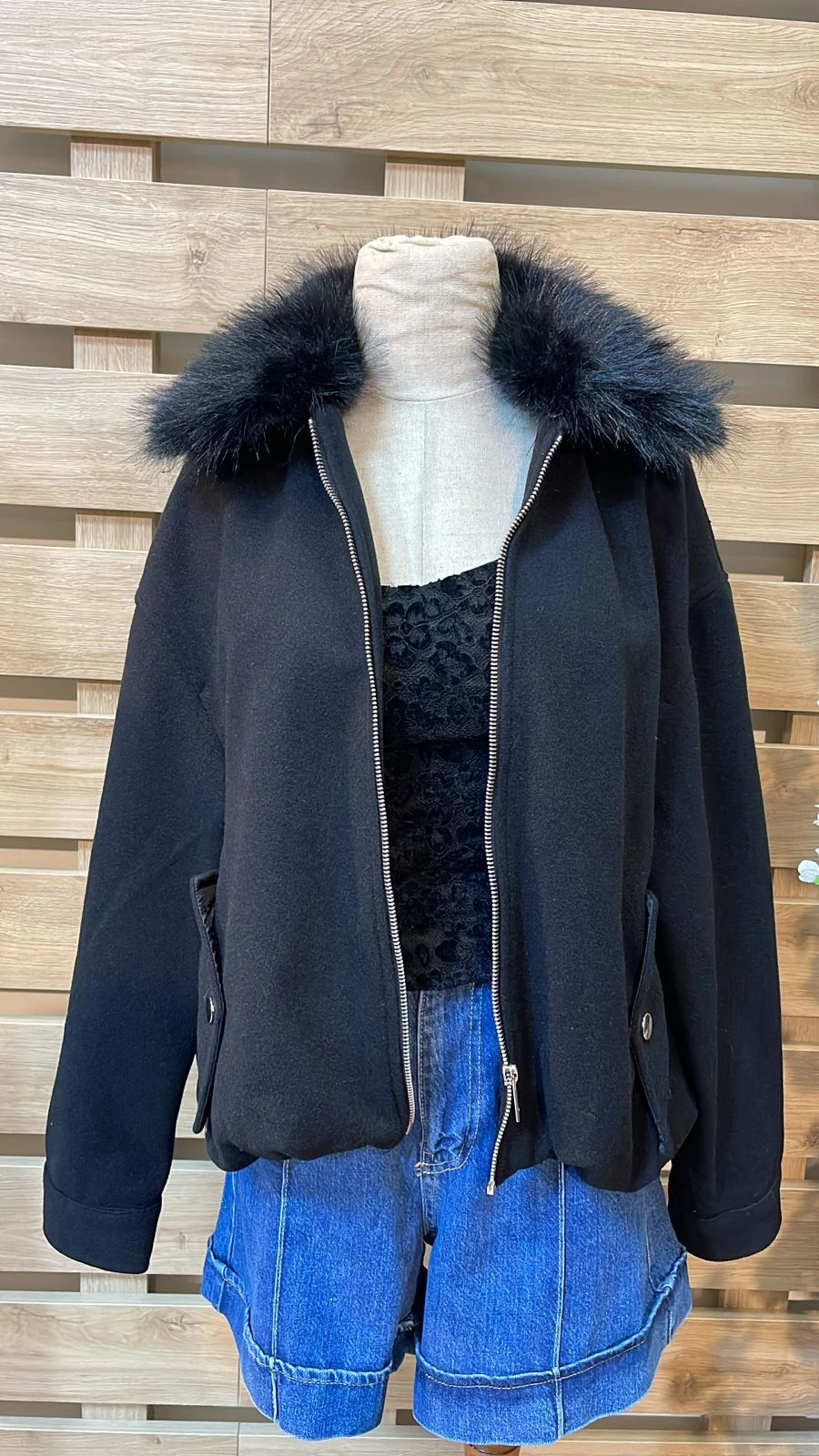 Hooded Fur Zipped Black Jacket