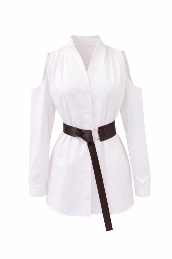 Belted Open Shoulder White Shirt