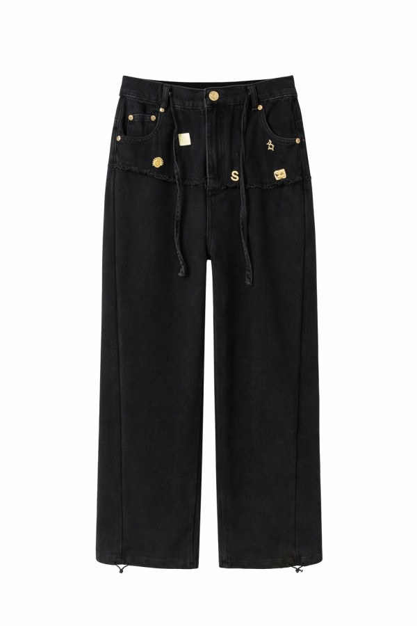 Mini Brooches Detailed Faux Denim Black Pants